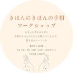 2026年4月11日 / 最終更新日時 : 2026年4月11日 frorogn0819 ブログ 5/5(祝・月)きほんのきほんの手相ワークショップ きほんのきほん手相ワークショップを開催します。多分5年ぐらいぶり…。 今回のワークショップでは基本の基本のざっくり部分をお話していきます。複雑に見える手相でも、基本に沿ってシンプルに読み解いていけば、わかることはたくさん […]