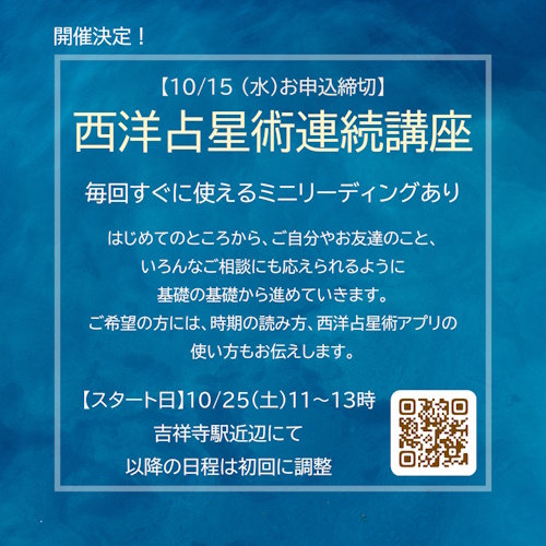 【10/15(水)お申込締切】10/25(土)より西洋占星術連続講座(土曜コース)を開催します。