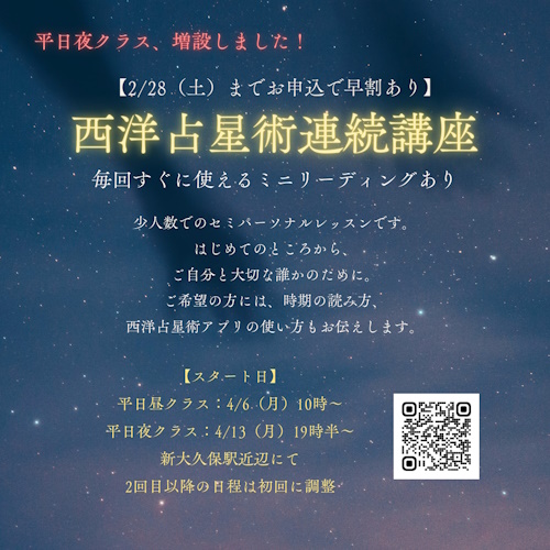 4月よりより西洋占星術連続講座(平日昼クラス・夜クラス)を開催します。(早割あり)