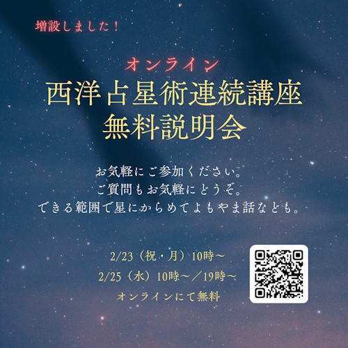 西洋占星術連続講座無料説明会、2/25(水)午前・夜も増設します。