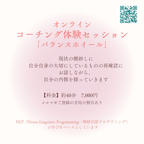自分自身では当たり前すぎて気が付きにくい中に、あなたにしかない大切なものはあるのかもしれません。ここではNLP(神経言語プログラミング―Neuro-Linguistic Programming)をベースとしたコーチングの技術を使います。