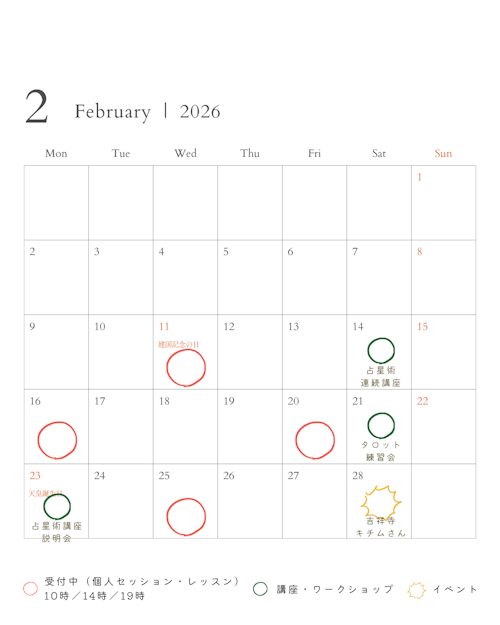2/23(月) 10時/14時/19時(午前と夜:占星術無料説明会→☆)